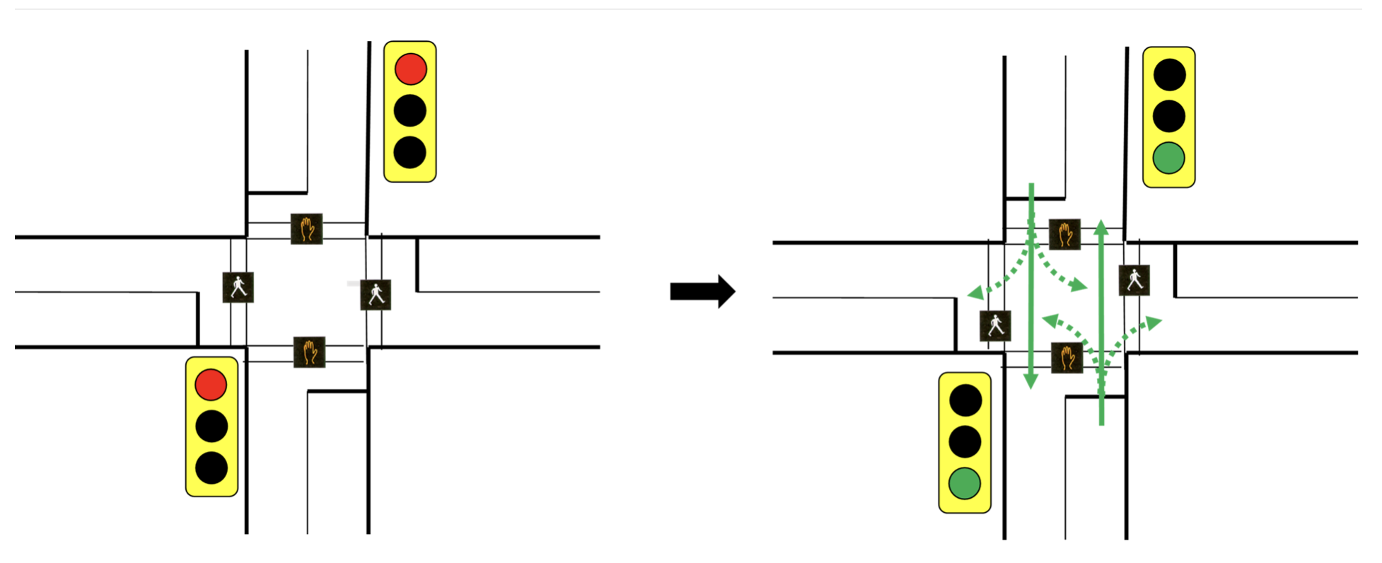 Nessas interseções, o sinal para pedestres é programado para abrir alguns segundos antes do verde surgir para os veículos que vão fazer uma conversão. Essa diferença de tempo varia entre 7 e 11 segundos dependendo do tamanho da travessia e dá uma “vantagem competitiva” para quem faz a travessia, permitindo que a pessoa saia do ponto cego dos motoristas antes da liberação da conversão dos carros.