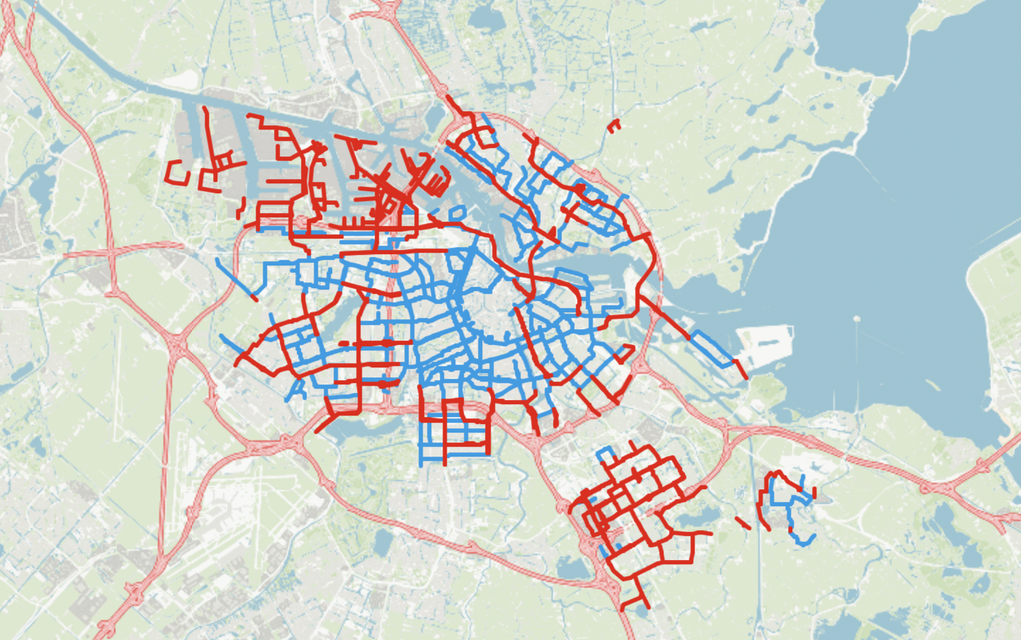 As ruas em azul ganharam limite de 30 km/h, enquanto as em vermelho ficaram com uma velocidade máxima de 50 km/h. Fonte: Prefeitura de Amsterdã.