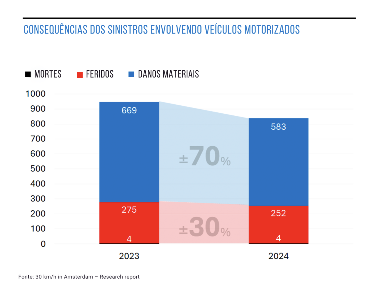 Segurança viária – O saldo foi positivo, com queda de 11% no número sinistros envolvendo um ou mais veículos motorizados nas ruas GOW30 entre 2023 e 2024. No primeiro ano foram 926 ocorrências e, no segundo, foram 823. Aqui, não entraram dados relativos a sinistros envolvendo apenas ciclistas ou ciclistas e pedestres, dado que estes acontecimentos não são influenciados pelo limite de velocidade, mas por fatores externos.