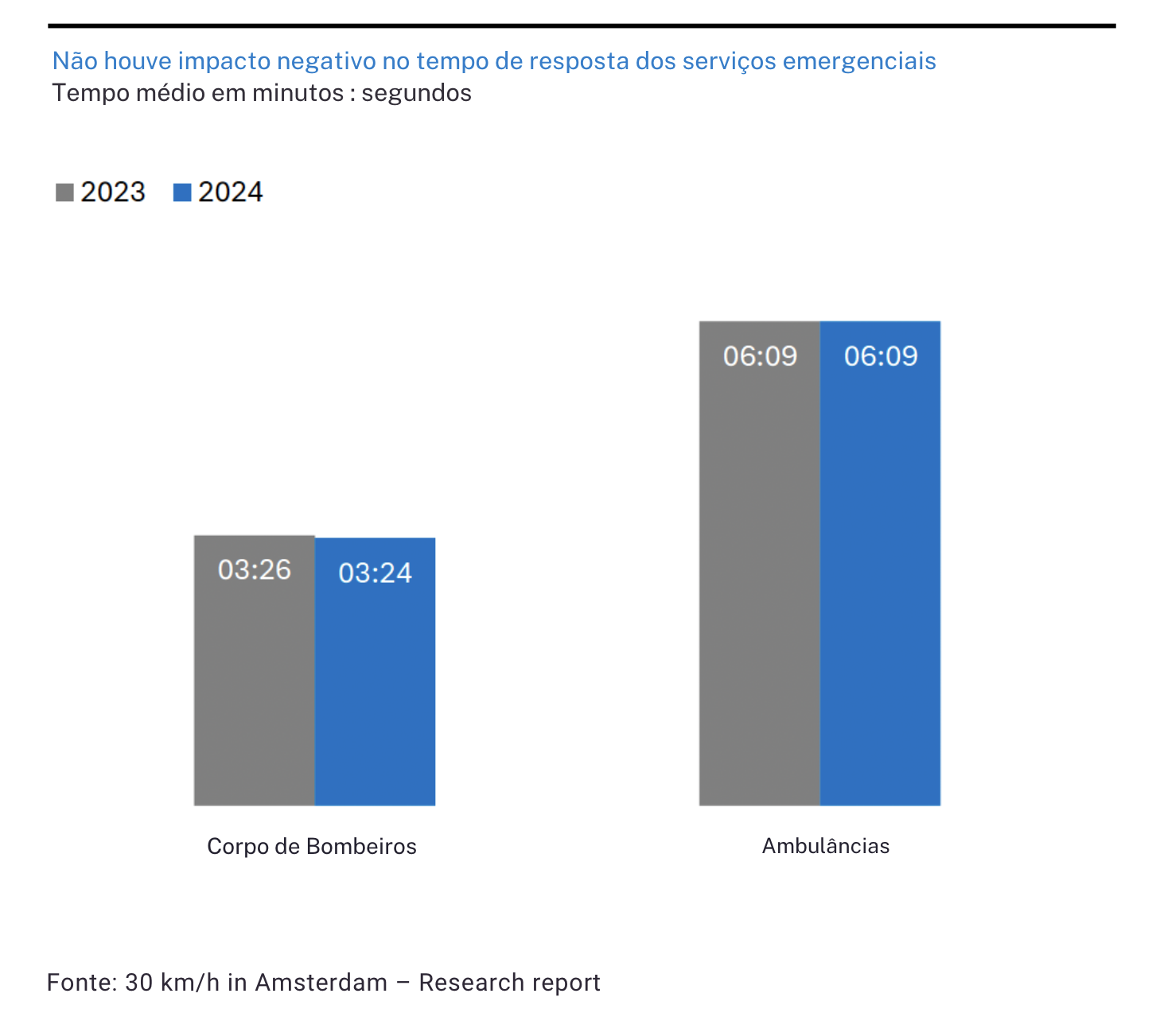 Tempo de deslocamento – Uma análise minuciosa de cerca de 8.000 atendimentos feitos pelo Corpo de Bombeiros local mostrou que o tempo gasto até se chegar ao local do incidente se manteve o mesmo ou um pouco diferente do que ocorria antes da introdução do limite de 30 km/h. Do mesmo modo, o escrutínio de 50.000 atendimentos feitos por ambulância teve como resultado o mesmo tempo médio de viagem antes e depois da mudança da velocidade, exatos 6 minutos e 9 segundos.