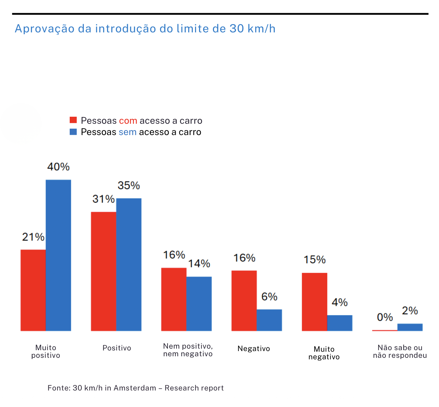 Aprovação – A maioria dos residentes de Amsterdã apoia o limite – esta foi a conclusão de um painel realizado em julho de 2024 com cerca de 1.500 moradores da cidade sobre o que achavam da introdução do limite de 30 km/h em 80% das vias do município. Desse total, 75% das pessoas que não têm acesso a um carro tem uma opinião positiva ou muito positiva sobre a medida. Mesmo entre o pessoal com acesso a carro, a boa opinião também imperou, chegando a 52% dos respondentes.
